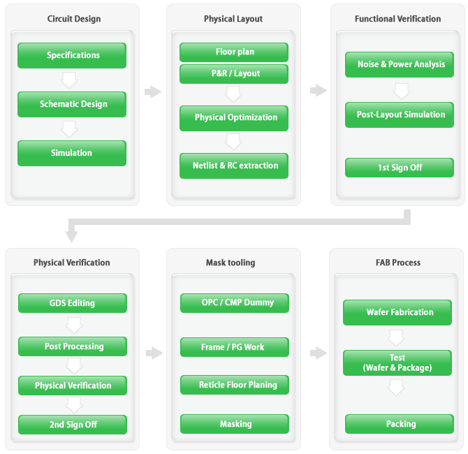 It supports the whole process from the circuit design to the FAB service as the analog & mixed mode customer layout service, or the service for each stage wanted by the customer can be rendered.