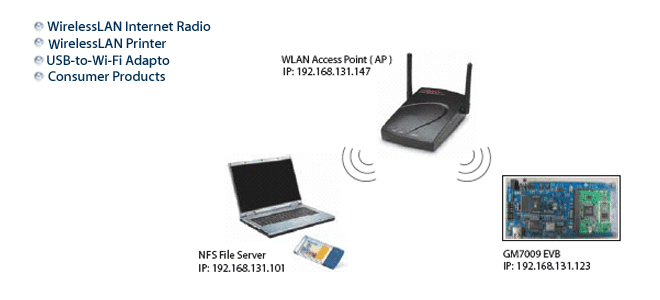 Among the most popular applications, GM7009 addresses the Internet radio. With the in-house wireless LAN driver