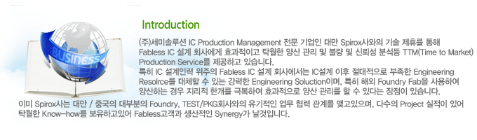 (ÁÖ)¼¼¹Ì¼Ö·ç¼ÇÀº IC Production Management Àü¹® ±â¾÷ÀÎ ´ë¸¸ Spirox»ç¿ÍÀÇ ±â¼ú Á¦ÈÞ¸¦ ÅëÇØ Fabless IC ¼³°è ȸ»ç¿¡°ÔÈ¿°úÀû À̰í Ź¿ùÇÑ ¾ç»ê °ü¸® ¹× ºÒ·® ¹× ½Å·Ú¼º ºÐ¼® µî TTM(Time to Market)Production Service¸¦ Á¦°øÇϰí ÀÖ½À´Ï´Ù.