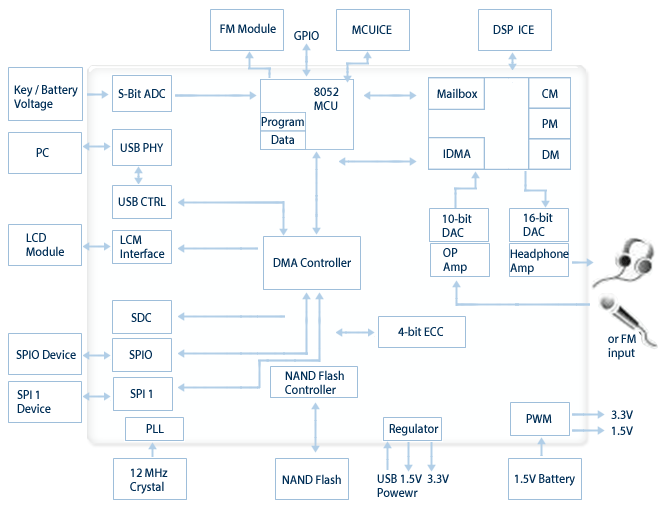 | GM7006 is a highly integrated single-chip digital audio system. It is built in a variety of popular audio codecs, including MP3 decoder, WMA decoder, IMA ADPCM encoder, IMA ADPCM decoder, JPEG decoder, and Motion JPEG. A high performance DSP is in charge of the decoding and encoding, and a USB 2.0 device interface is responsible for the audio and/or voice data transmission between GM7006 and the USB host. GM 7006 also includes interfaces for NAND flash, SPI, LED/LCD modules, push buttons, headphones, microphones, and FM radios. |
