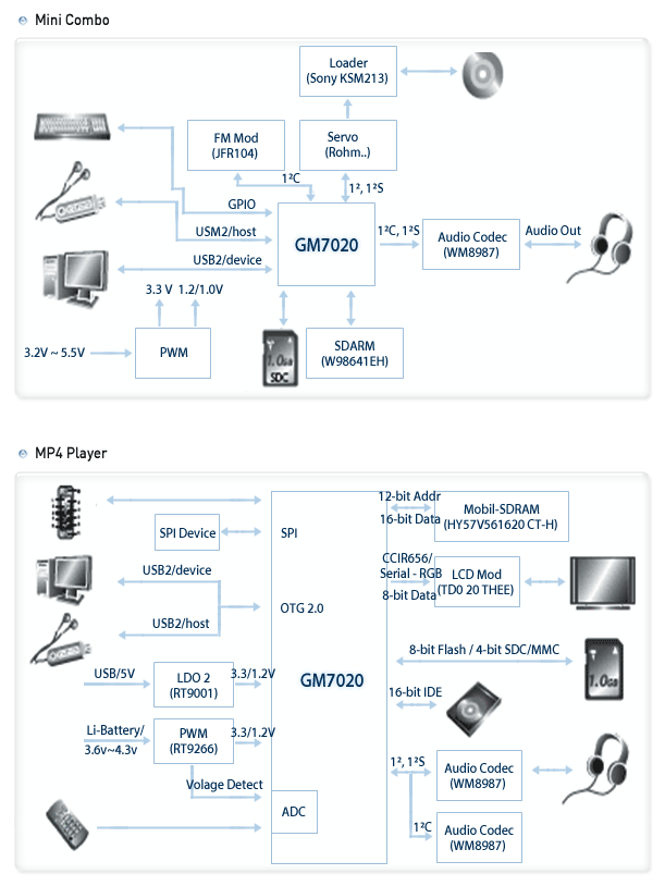| Grain Media's GM7020 is an audio SoC solution which integrates a 32-bit RISC CPU, a media coprocessor and peripheral functions for developing high-performance and low-power portable multimedia devices. It incorporates several of GM's proprietary technologies, such as silicon-proven IPs, CPU architecture optimized for audio processing, and ultra-low power design technology to present the leading MIPS/mW performance among the industry. GM7020 supports various popular audio formats, which include the MP3 encoder/decoder, WMA decoder, OGG decoder, AAC decoder and IMA ADPCM codec. It also supports multiple video decoders, such as the JPEG/MEPG-4 decoders. Comprising interfaces of NAND flash, SD/MMC, and IDE, GM7020 supports both flash-based and HDD-based storage devices. |